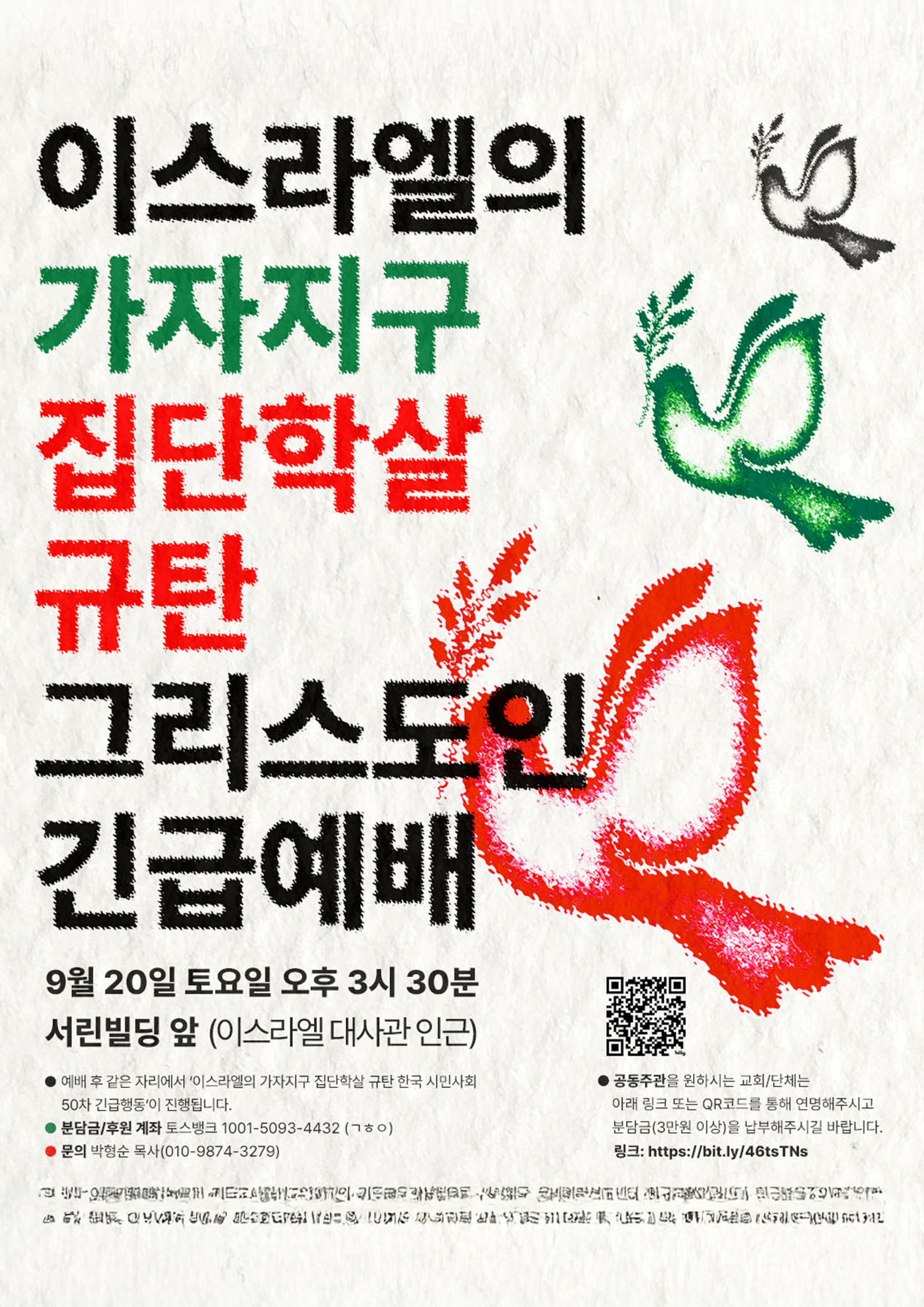 이스라엘의 집단학살로 6만명이 넘는 가자지구 민간인이 사망했습니다. 가자지구를 향한 이스라엘의 광기는 멈출 줄 모르고 확대되기만 합니다. 이스라엘의 학살을 규탄하고, 팔레스타인인의 삶을 지지하는 그리스도인들이 모여 함께 예배하려 합니다.
