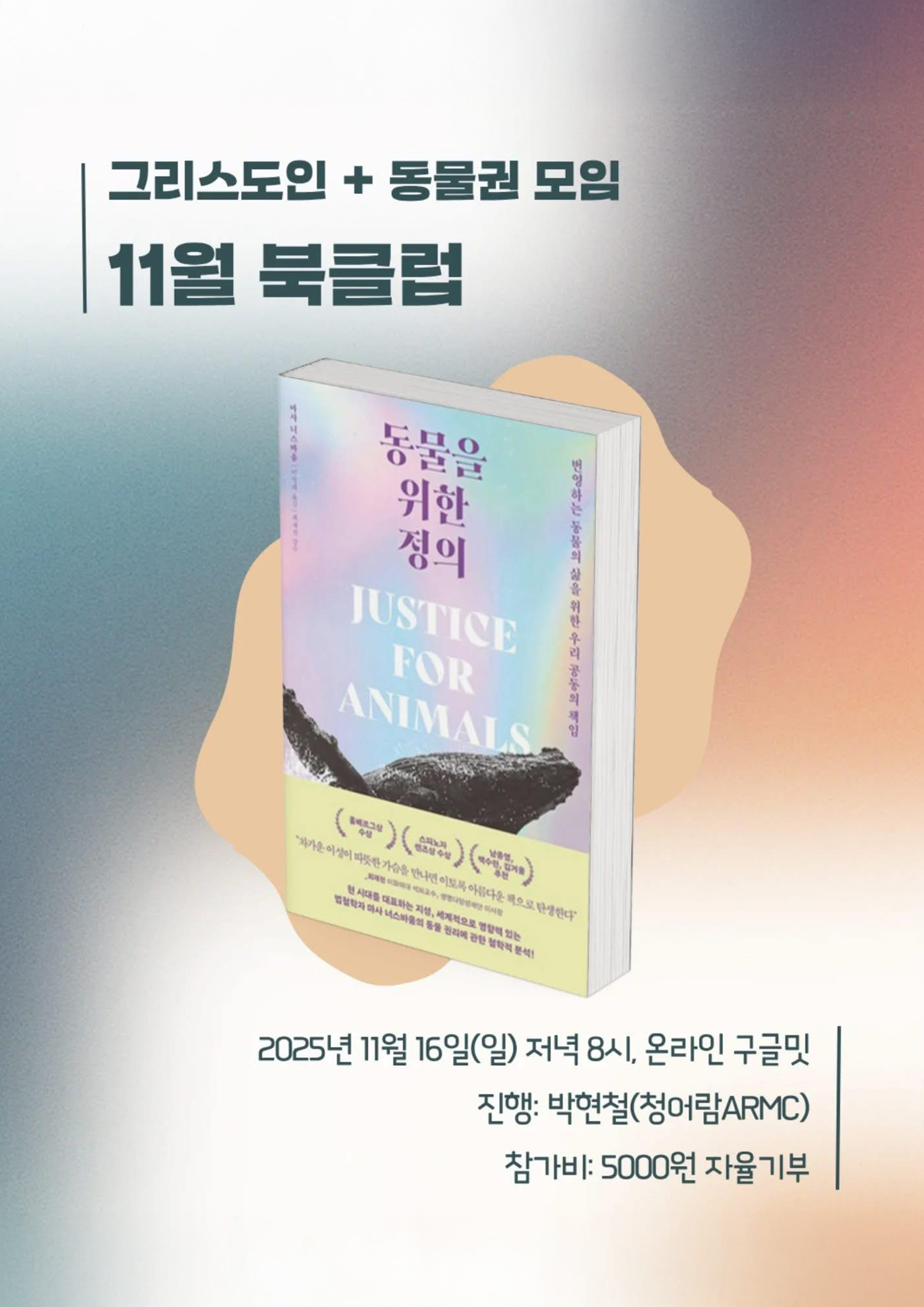 [연대] 그리스도인+동물권 11월 북클럽, <동물을 위한 정의> 함께 읽기 그리스도인+동물권 11월 모임에서는, 이 책을 진지하게 읽으며 하나님이 ‘보시기에 좋았던’ 세계를 다시 기억하고, 그 안에서 인간과 비인간이 함께 번영하는 삶을 함께 생각해보고자 합니다.