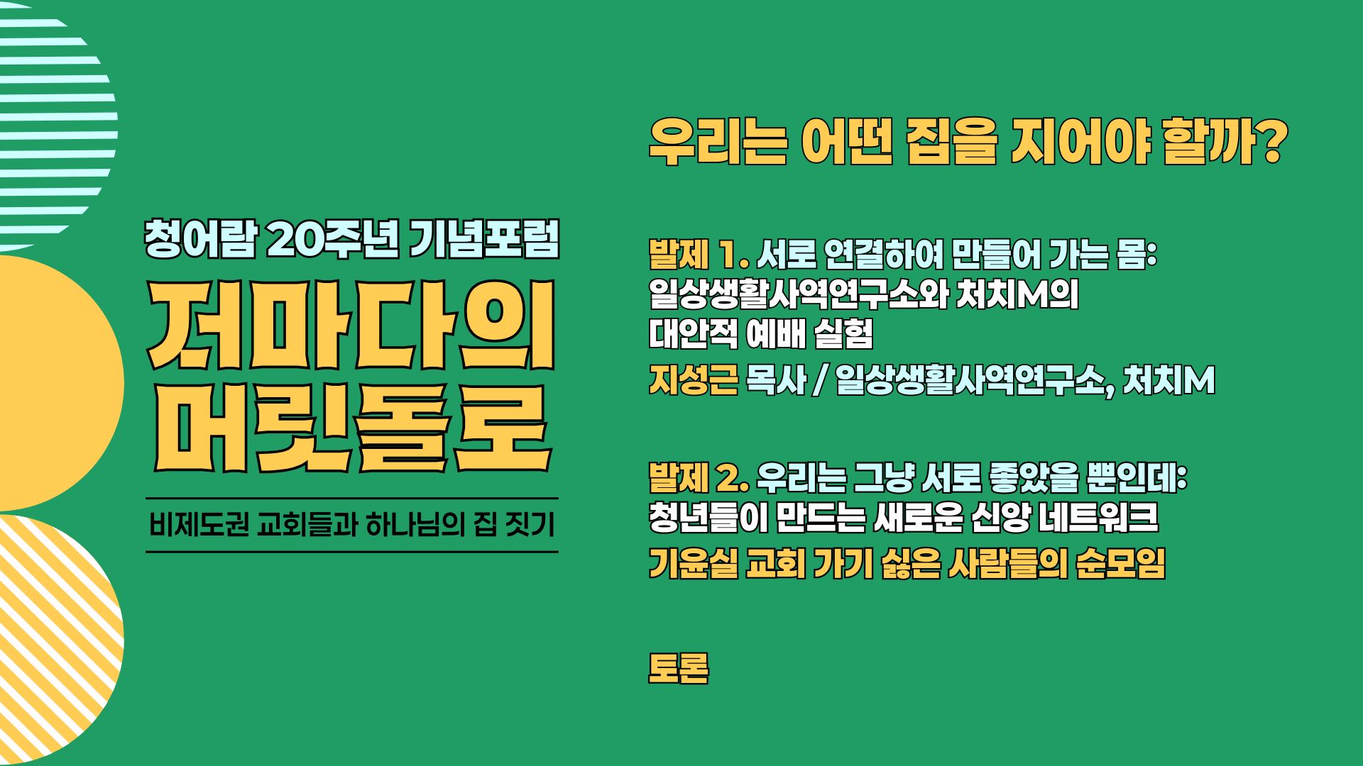 청어람에는 교회에 실망했거나 교회 안에서 채워지지 않는 신앙적 갈증을 느끼는 이들이 많이 찾아옵니다. 교회 안에서 자기 자리를 찾지 못하는 이들이 안전하게 자기 목소리를 낼 수 있는 곳을 찾아 저희 모임까지 오십니다. 저희는 그들에게 섣부른 답을 주기보다, 그저 서성일 수 있는 '정거장'이 되어주고, 자기 목소리를 낼 수 있는 작고 안전한 공간이 되고자 합니다. 함께 대화하고 신앙의 고민을 나누며, 궁극적으로 그들이 한걸음 더 나아간 신앙 여정을 지속할 수 있도록, 그리고 다시 건강한 공동체의 일원으로 연결될 수 있도록 돕는 '다리'가 되는 것이 저희 역할이라 생각합니다. 그런 점에서 저희는 단지 아카데미가 아니라, ‘일종의 교회’, ‘임시적인 교회’라고 생각합니다. 그리스도를 머리로 삼은 모든 교회가 그러하듯이 목사님의 교회와 청어람이 우주적 연합을 이루고 함께 협력할 일들이 많았으면 좋겠습니다.