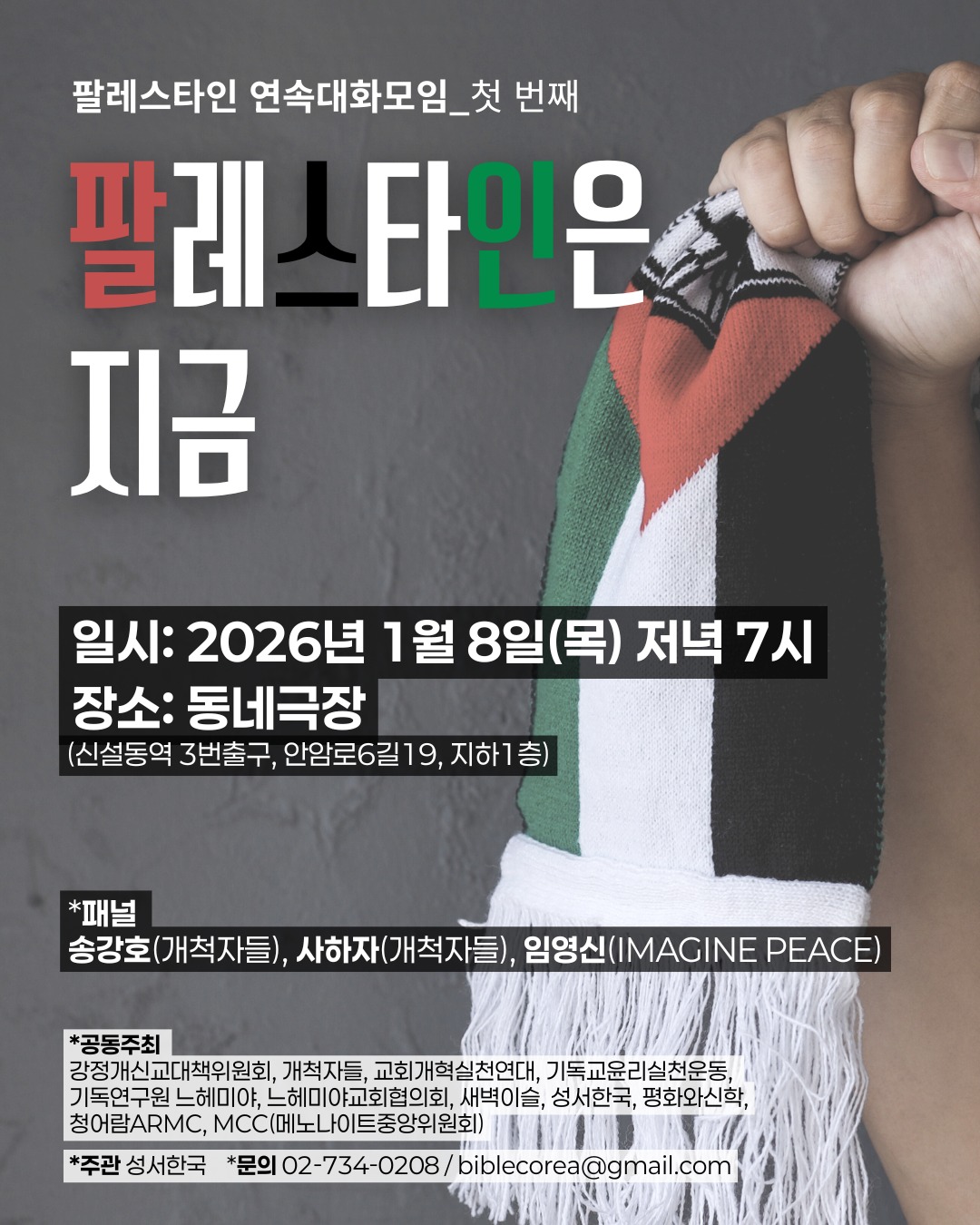 📍일시: 2026년 1월 8일(목) 저녁 7시 📍장소: 동네극장 (신설동역 3번 출구, 서울 동대문구 안암로6길 19, 지하1층) 📍패널: 송강호(개척자들), 사하자(개척자들), 임영신(IMAGINE PEACE) 공동주최: 강정개신교대책위원회, 개척자들, 교회개혁실천연대, 기독교윤리실천운동, 기독연구원 느헤미야, 느헤미야교회협의회, 새벽이슬, 성서한국, 평화와신학, 청어람ARMC, MCC(메노나이트중앙위원회) 주관: 성서한국 문의: 02-734-0208 / biblecorea@gmail.com *팔레스타인 연속 대화모임은 홀수 달 첫째 주 목요일에 열립니다.